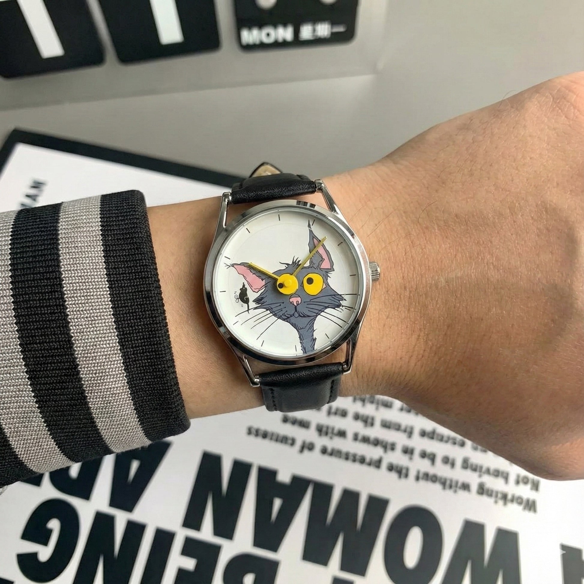 Add a touch of fun to your everyday style with this adorable Cat & Mouse Cartoon Wristwatch. Featuring a wide-eyed, quirky cat illustration and a tiny mouse detail on the dial, this watch blends cute charm with minimalist design. Whether you’re dressing casual, sporty, or campus-cool, it’s the perfect accessory that stands out without trying too hard.